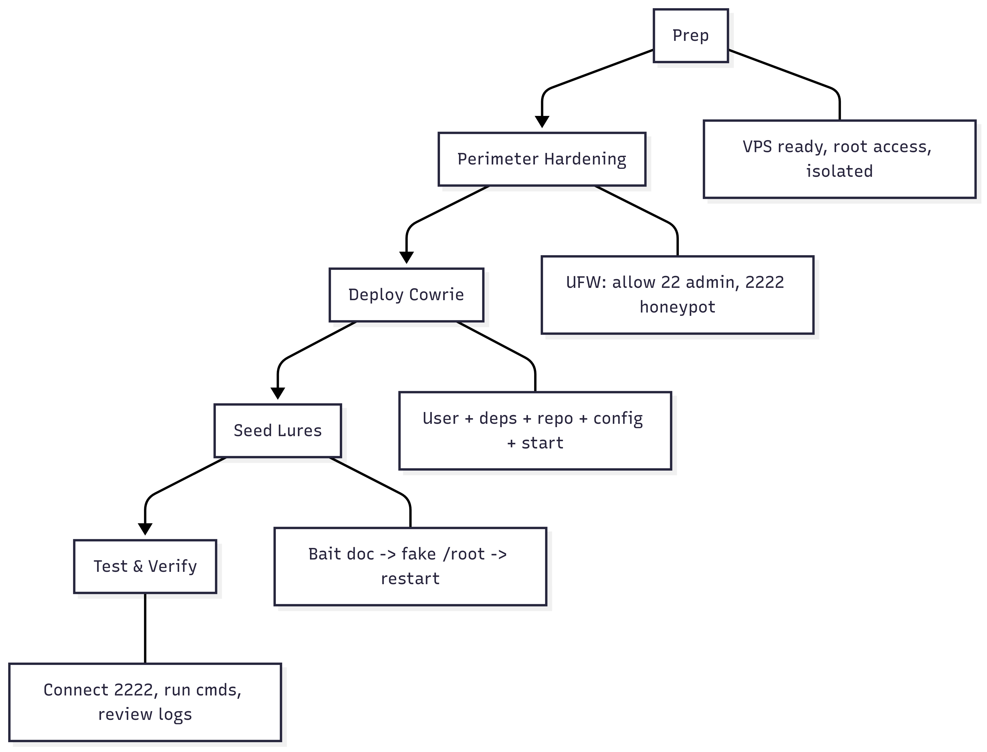 We deploy the Cowrie honeypot, isolating it from production and preparing it to log attacker activity.